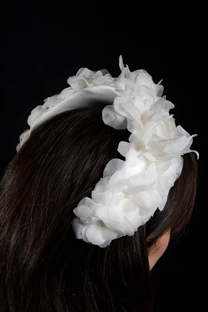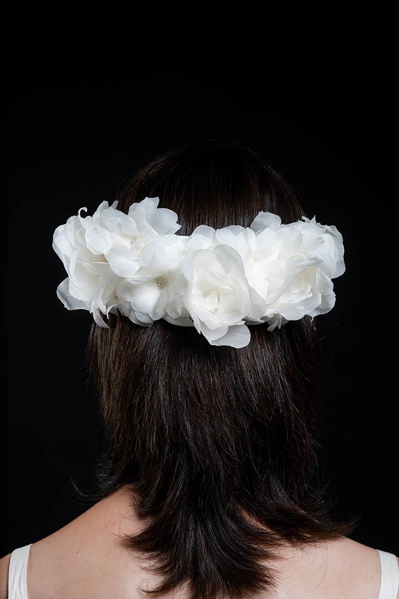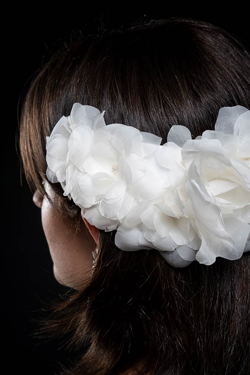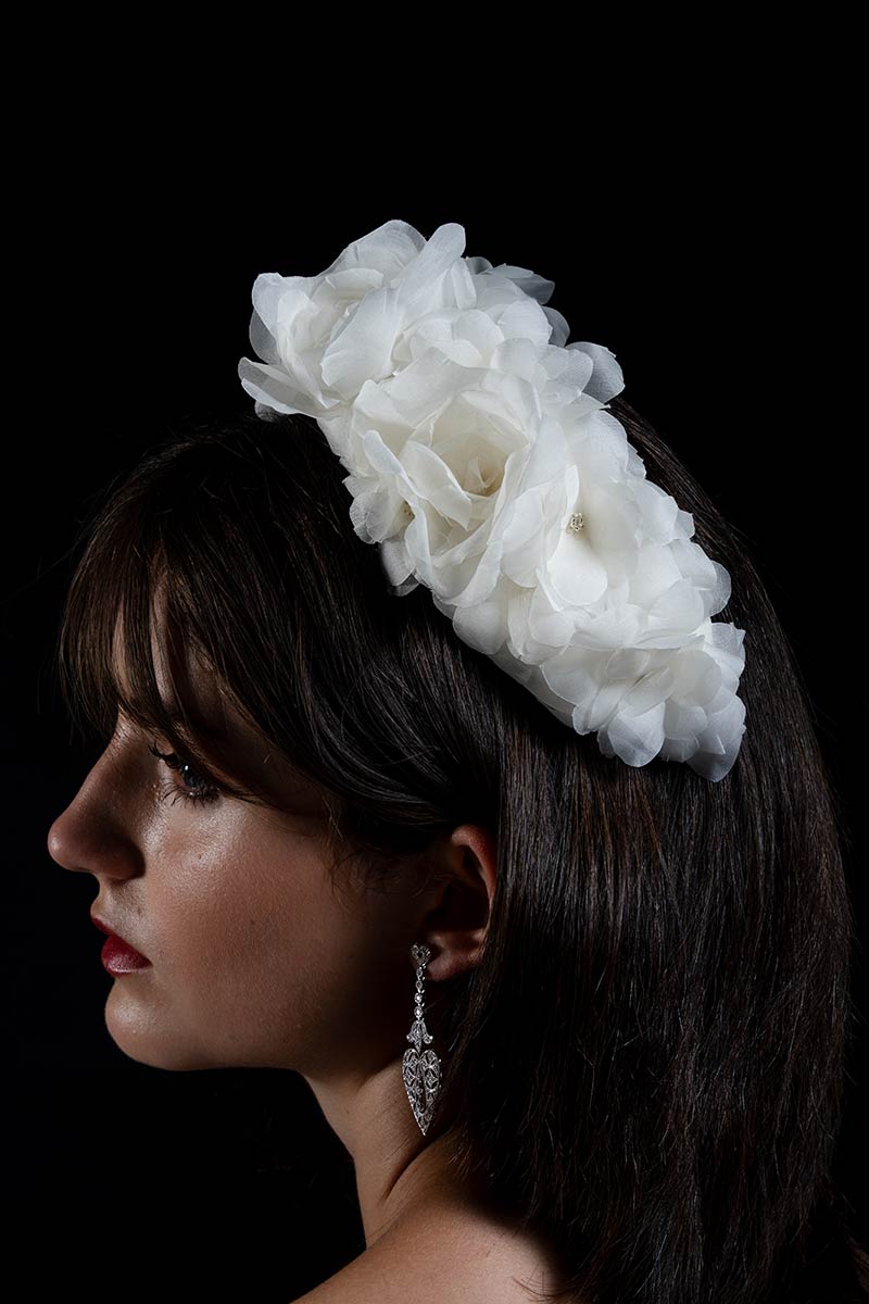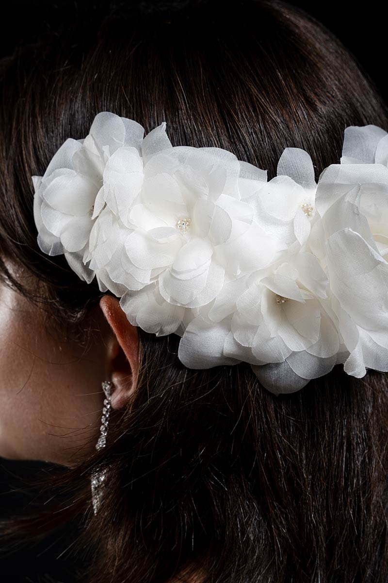 Banda forrada en crep de seda blanco cubierto de flores de organza de seda blanca combinando dos tipos de flor uno de ellos rematado en cristal de miyuki plateado. Pieza versátil tanto para uso delantero como trasero y aplicable a cualquier peinado o pelo suelto. Talla única.