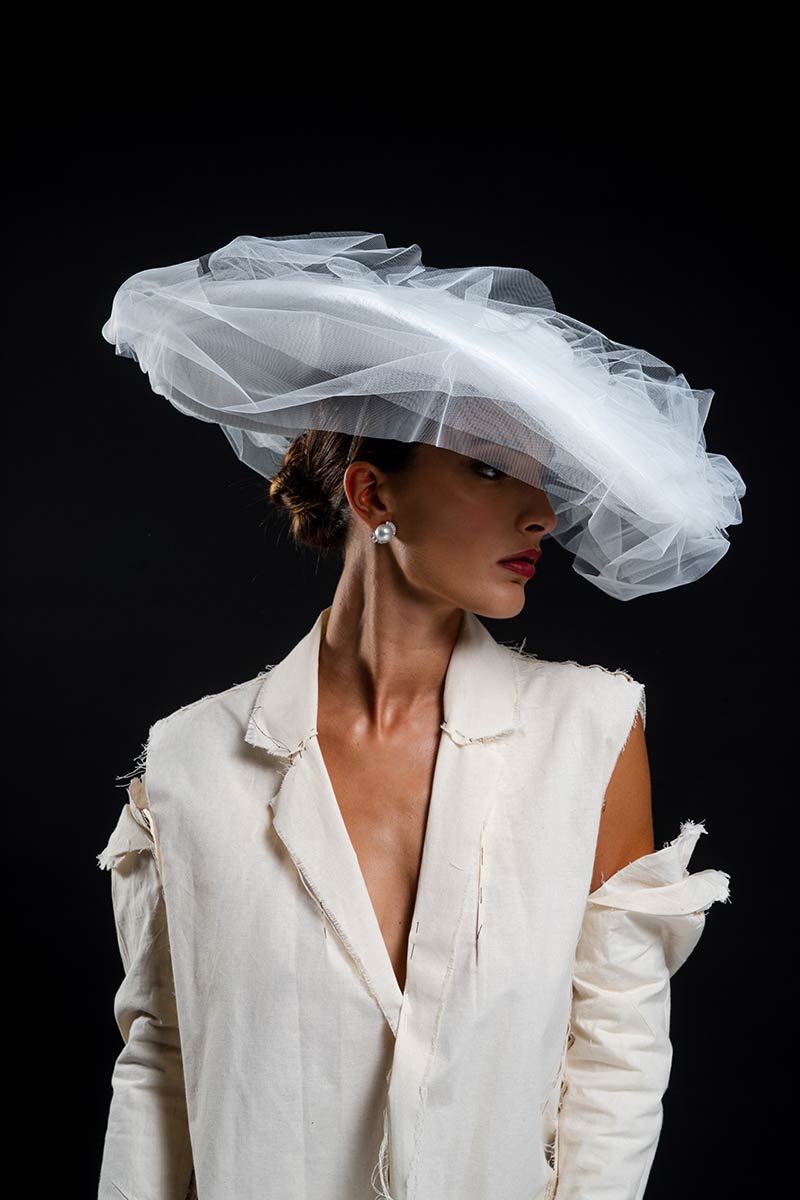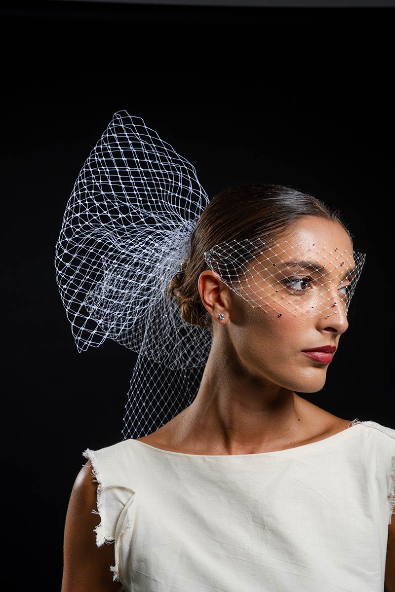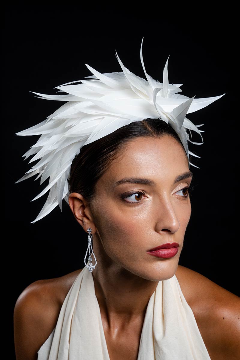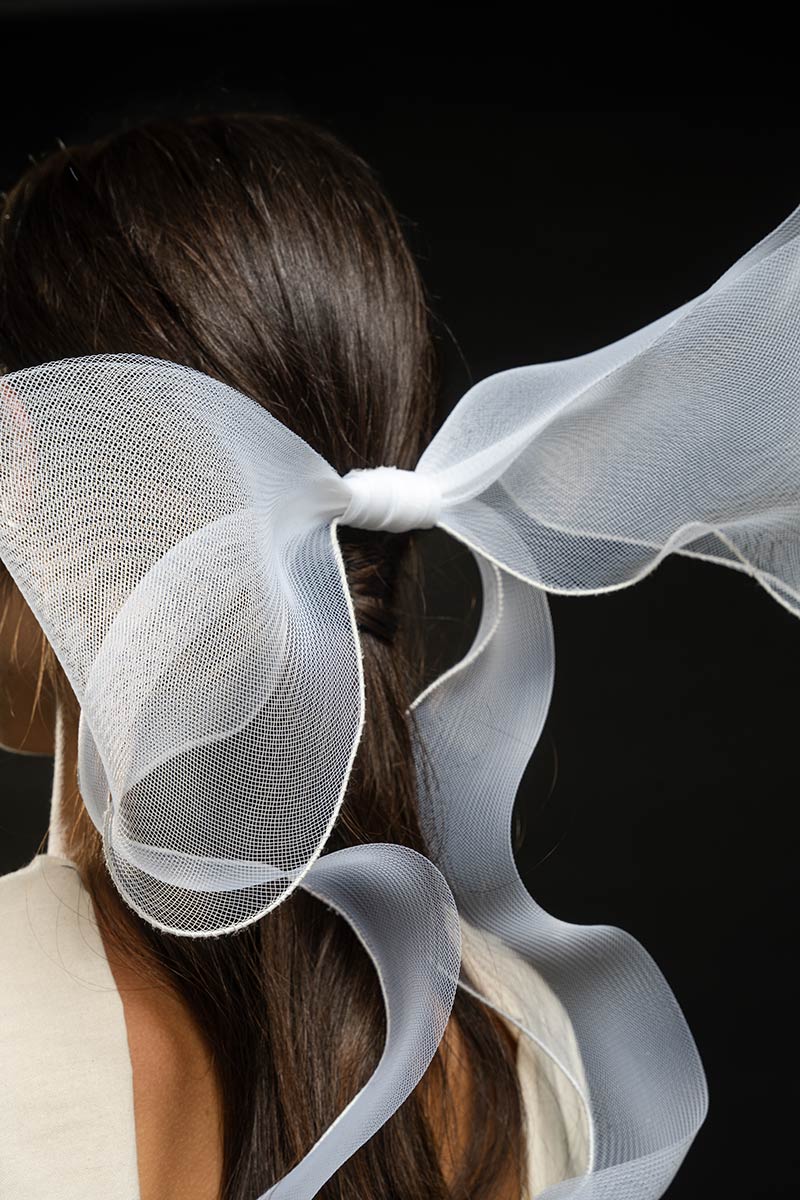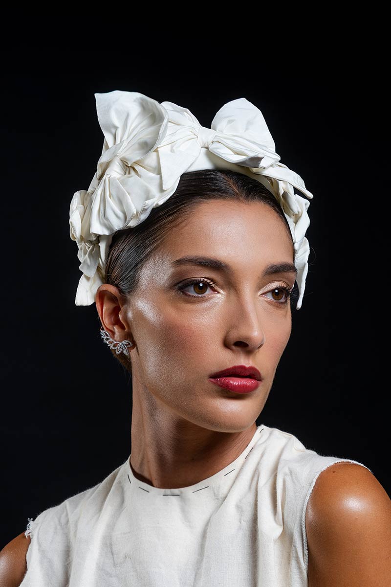Banda forrada en crep de seda blanco cubierto de flores de organza de seda blanca combinando dos tipos de flor uno de ellos rematado en cristal de miyuki plateado. Pieza versátil tanto para uso delantero como trasero y aplicable a cualquier peinado o pelo suelto. Talla única.