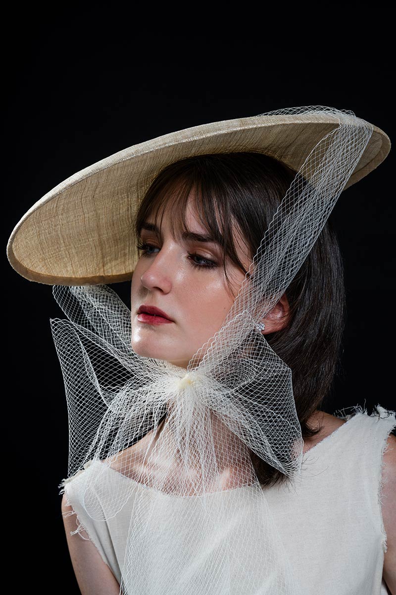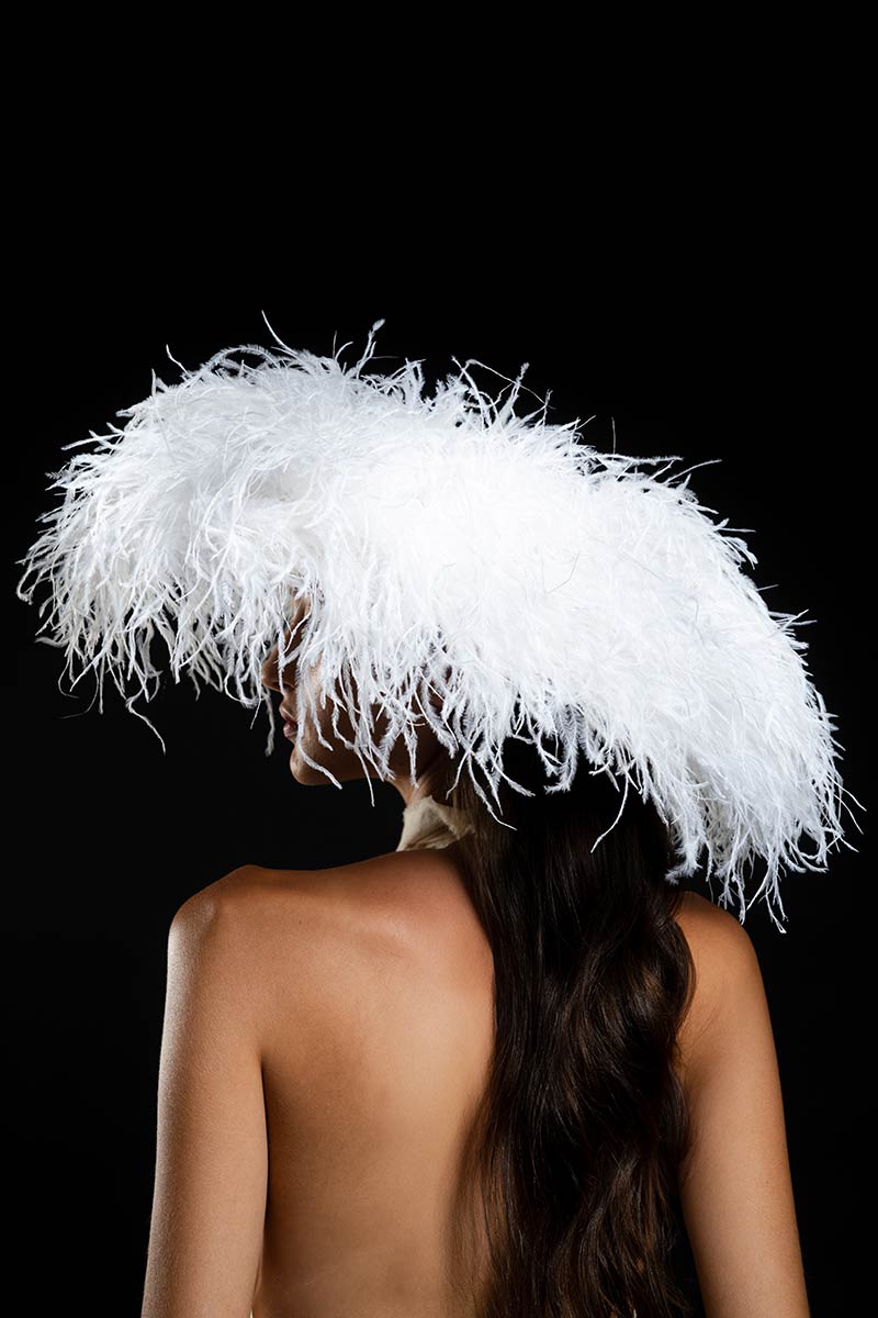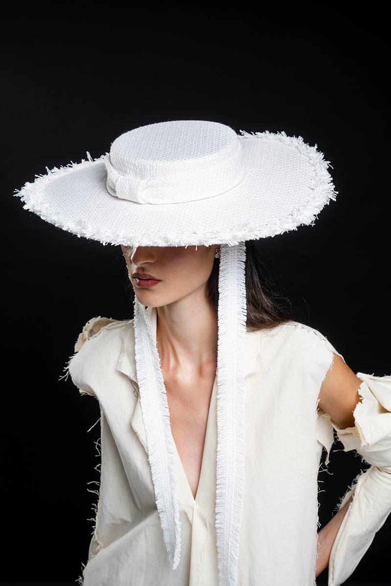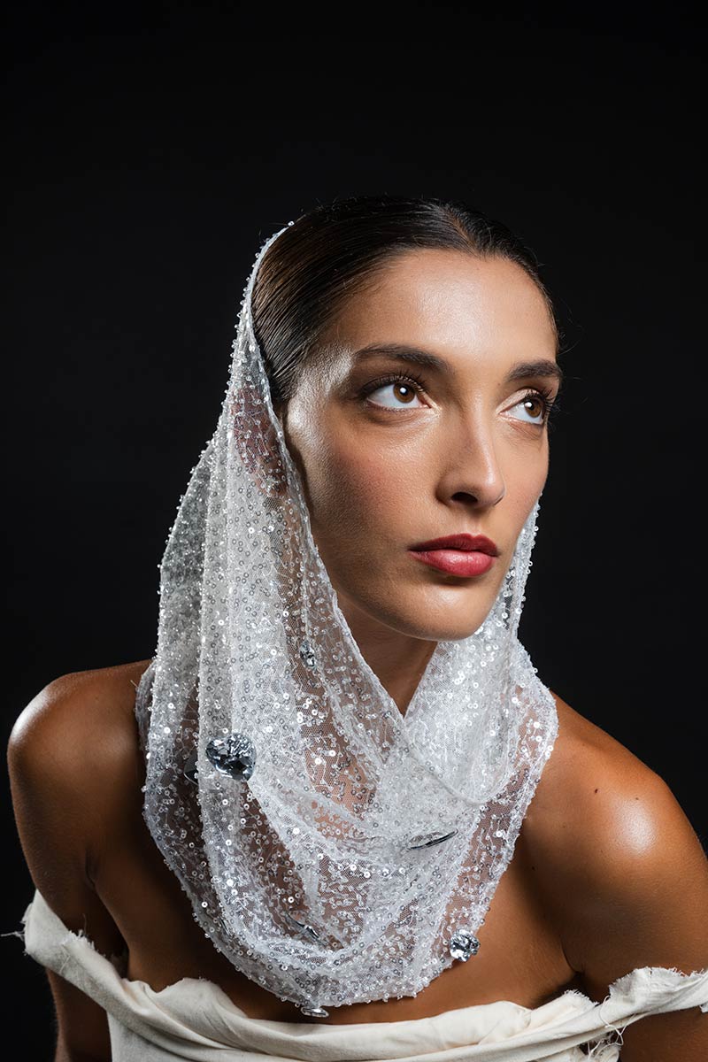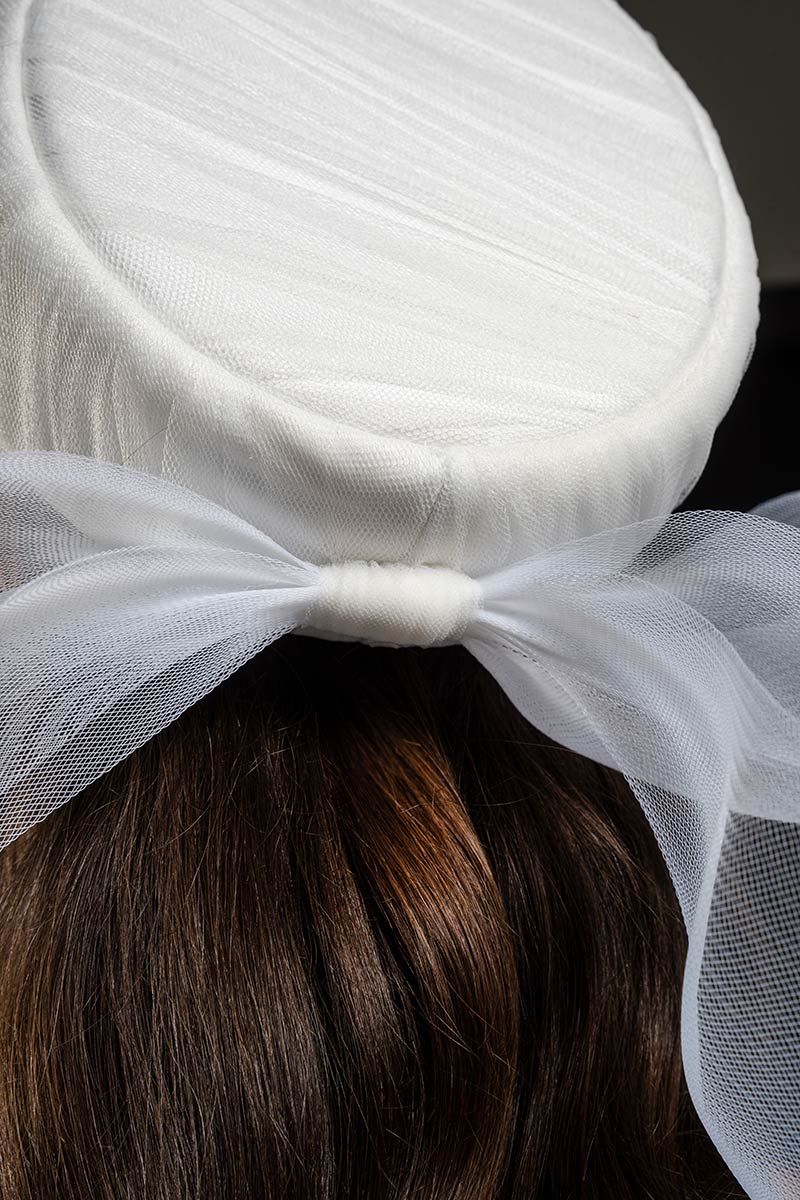 Banda forrada en crep de seda blanco cubierto de flores de organza de seda blanca combinando dos tipos de flor uno de ellos rematado en cristal de miyuki plateado. Pieza versátil tanto para uso delantero como trasero y aplicable a cualquier peinado o pelo suelto. Talla única.