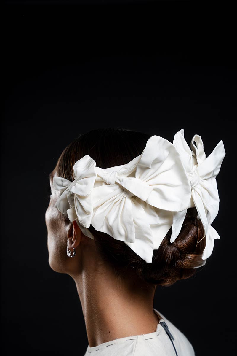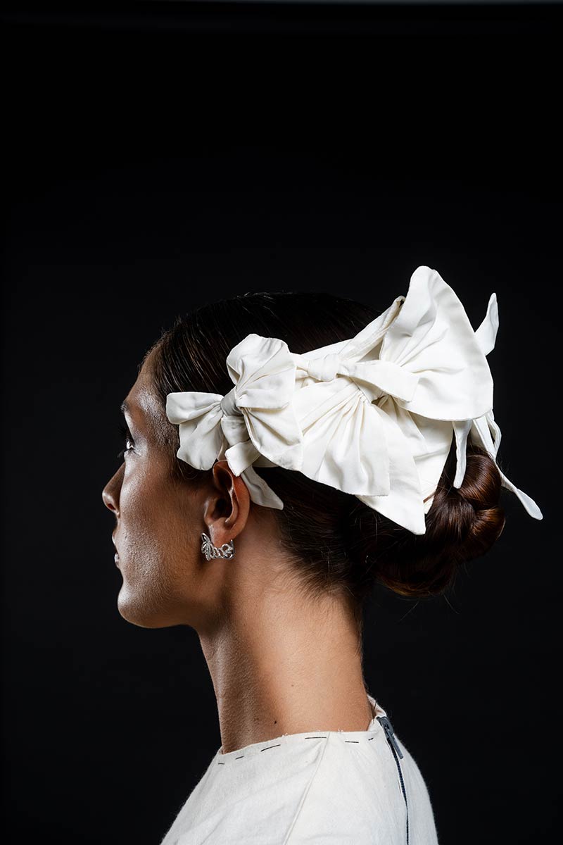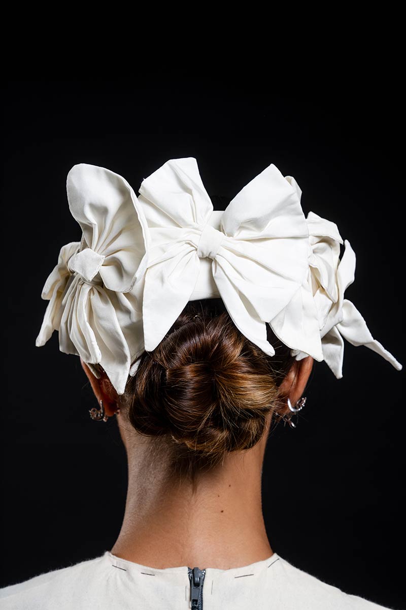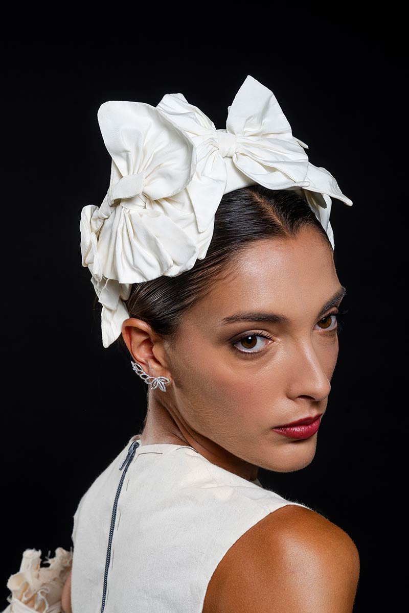 Banda de realizada con lazos en tafetán, pieza versátil tanto para ponerla en la parte delantera tipo diadma como en la parte de detrás, recomendable para cualquier peinado, recogido bajo, semirecogido o sulto. Talla única.