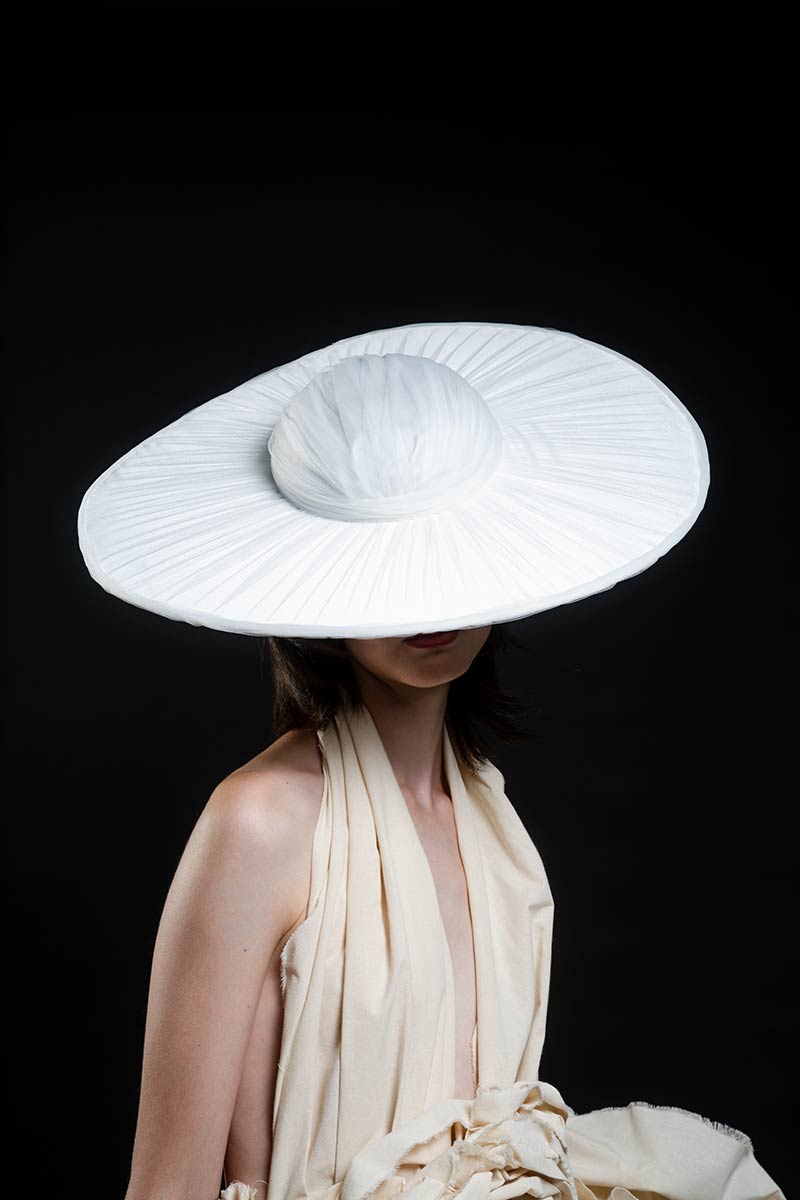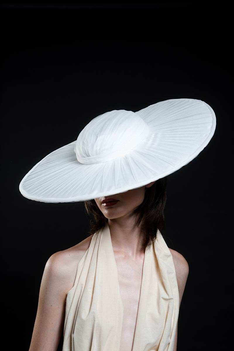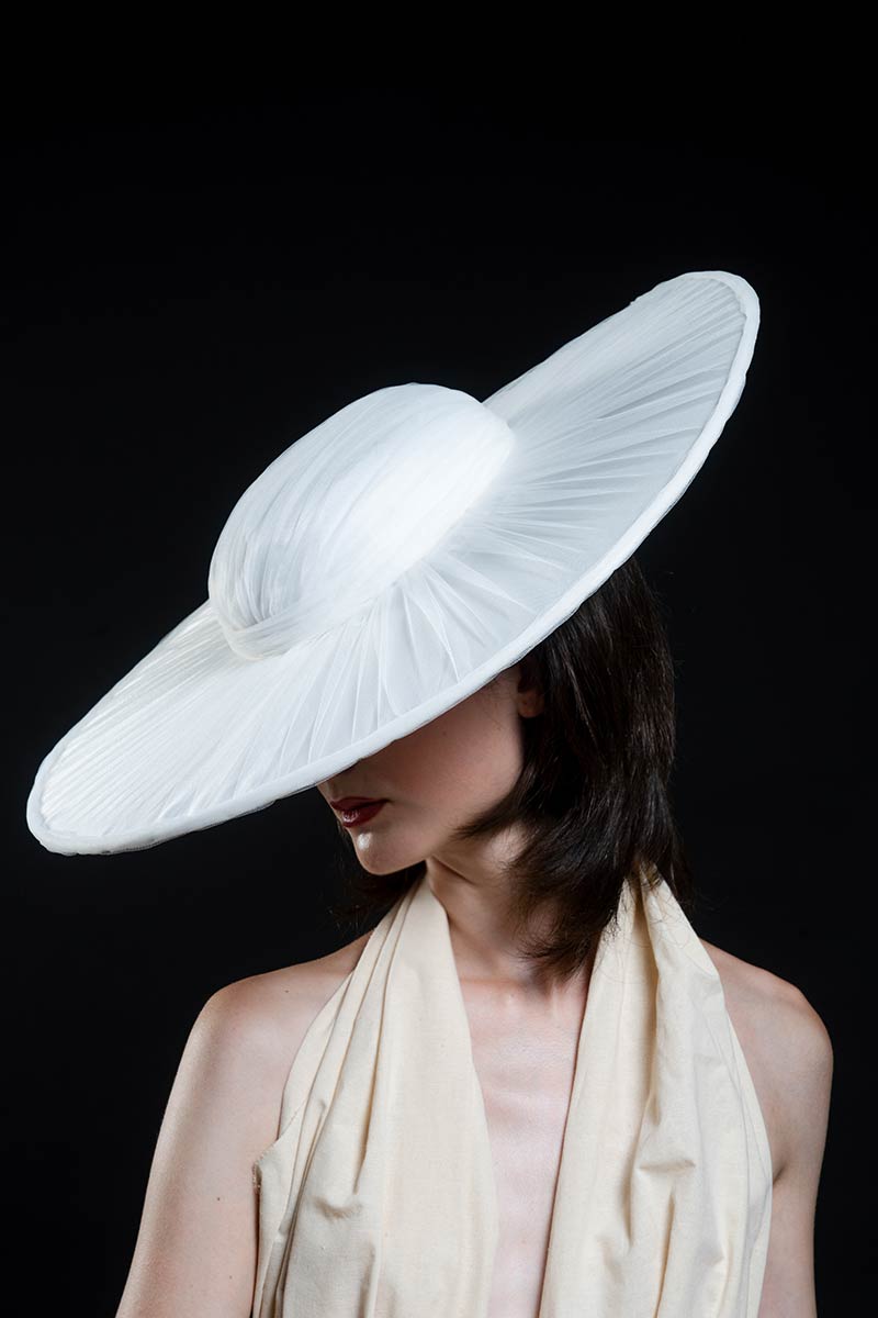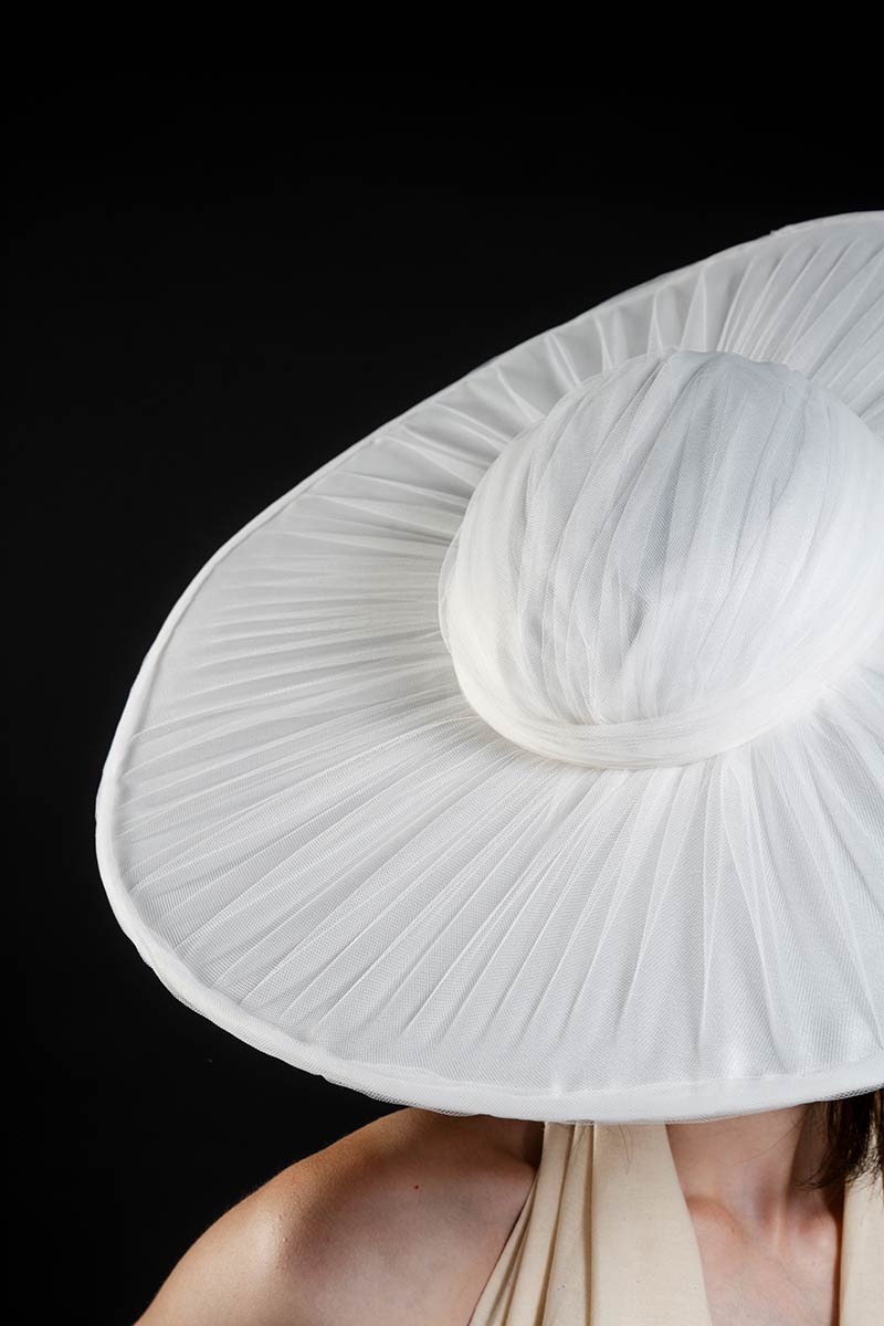 Pamela de 50cm de diámetro forrada en crepe de seda con tul plisado, recomendable para cualquier tipo de peinado. Talla: en un plazo de 48h nos pondremos en contacto contigo para ajustar la talla de tu pamela antes de comenzar la confección.