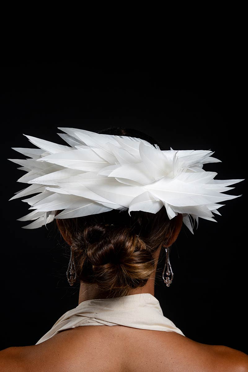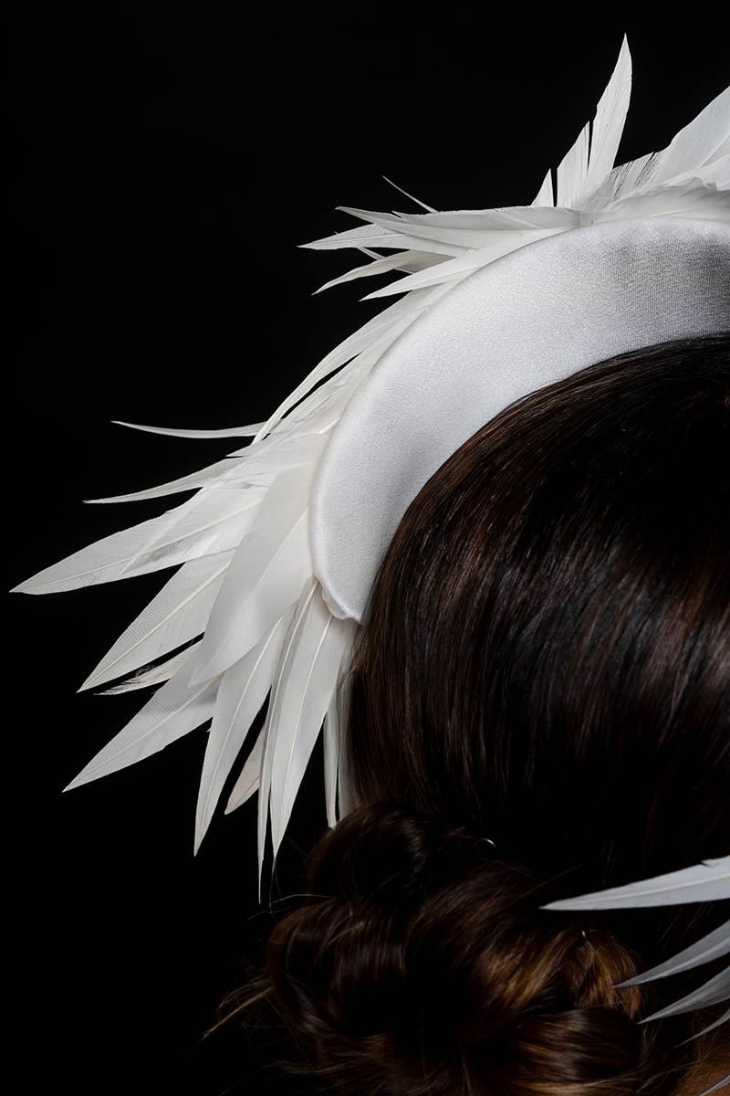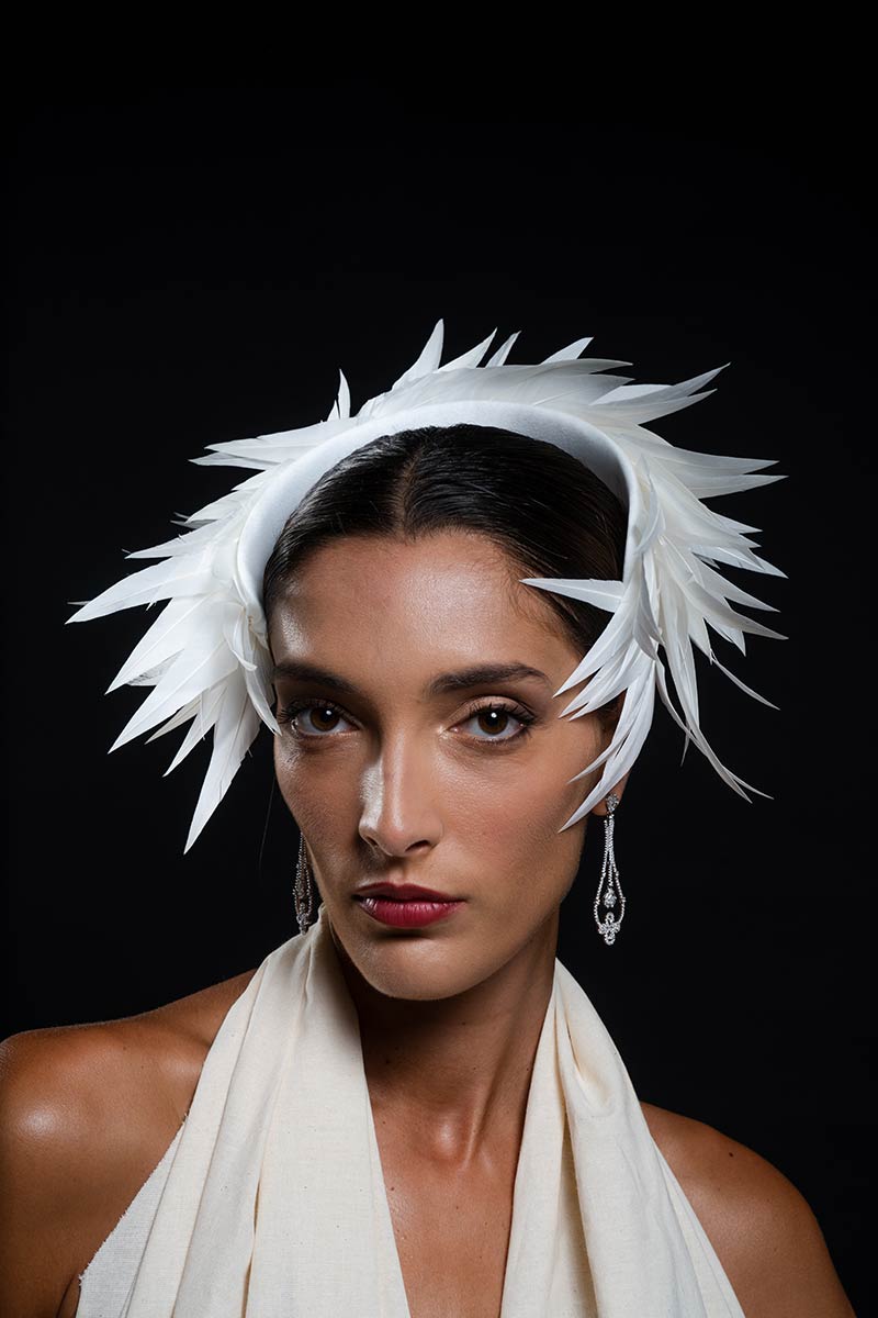 Descripción: banda de plumas blancas versátil para utilizar tanto en la parte trasera como delantera de la cabeza. Talla única.