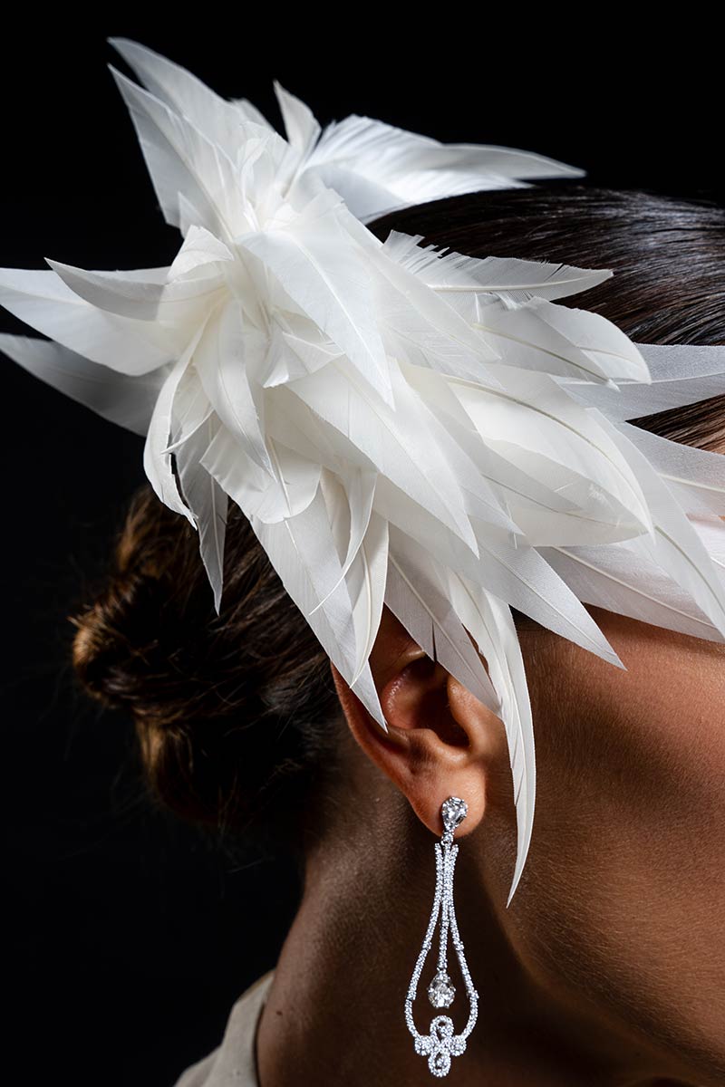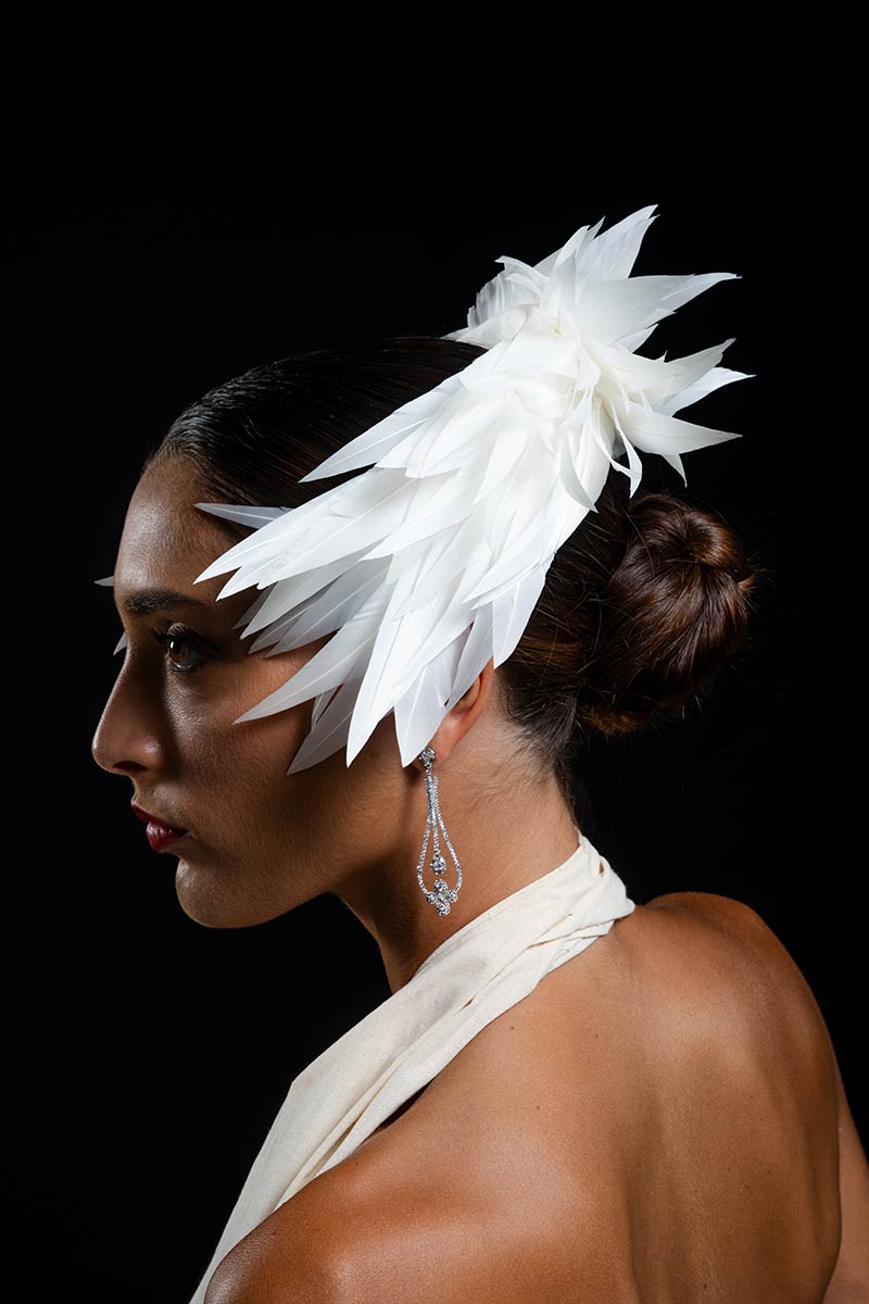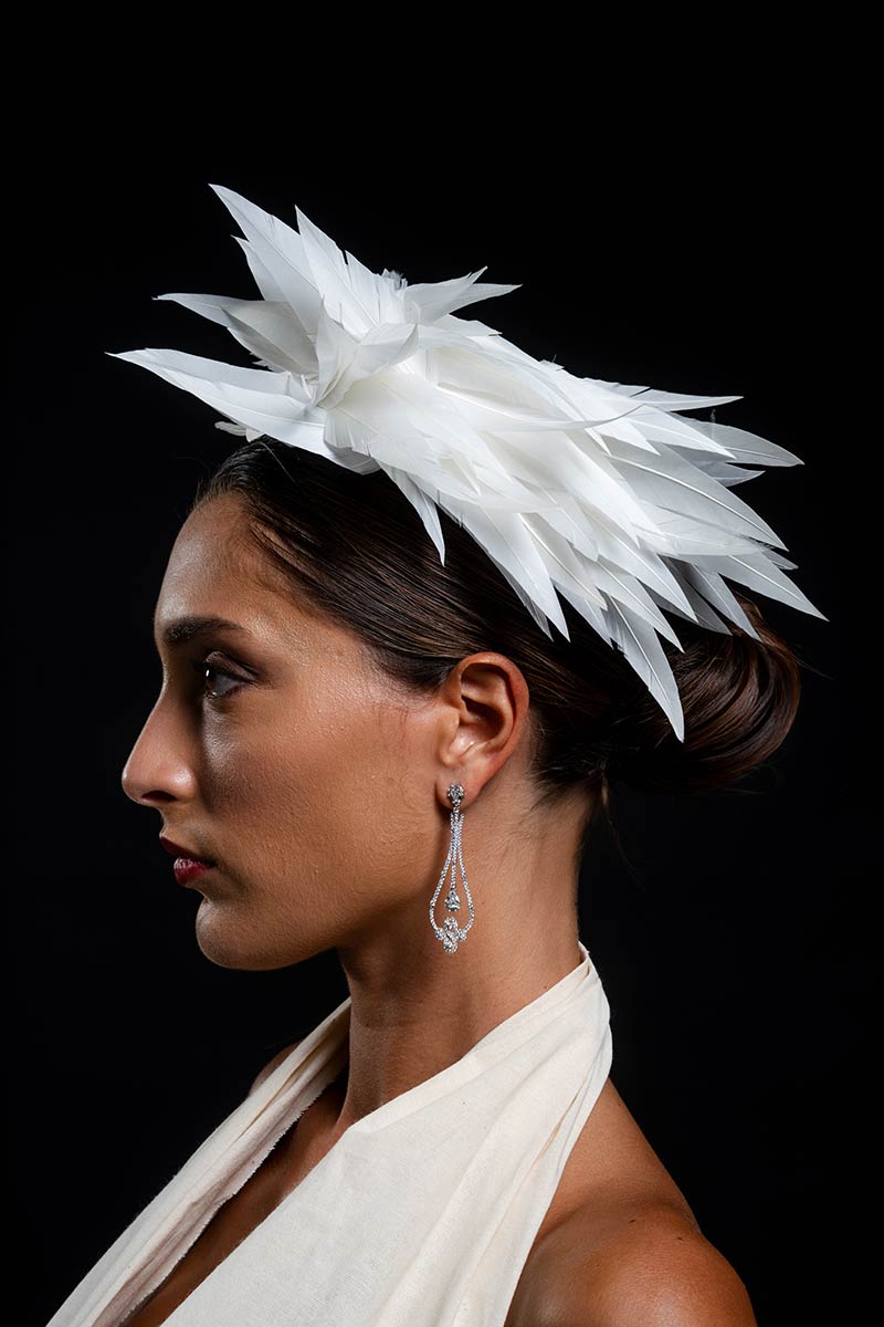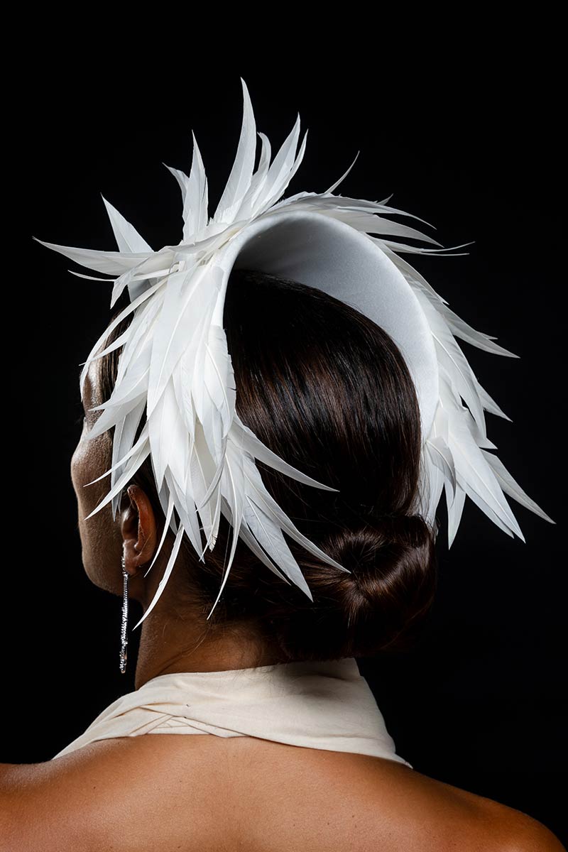 Descripción: banda de plumas blancas versátil para utilizar tanto en la parte trasera como delantera de la cabeza. Talla única.