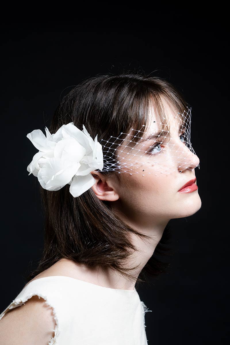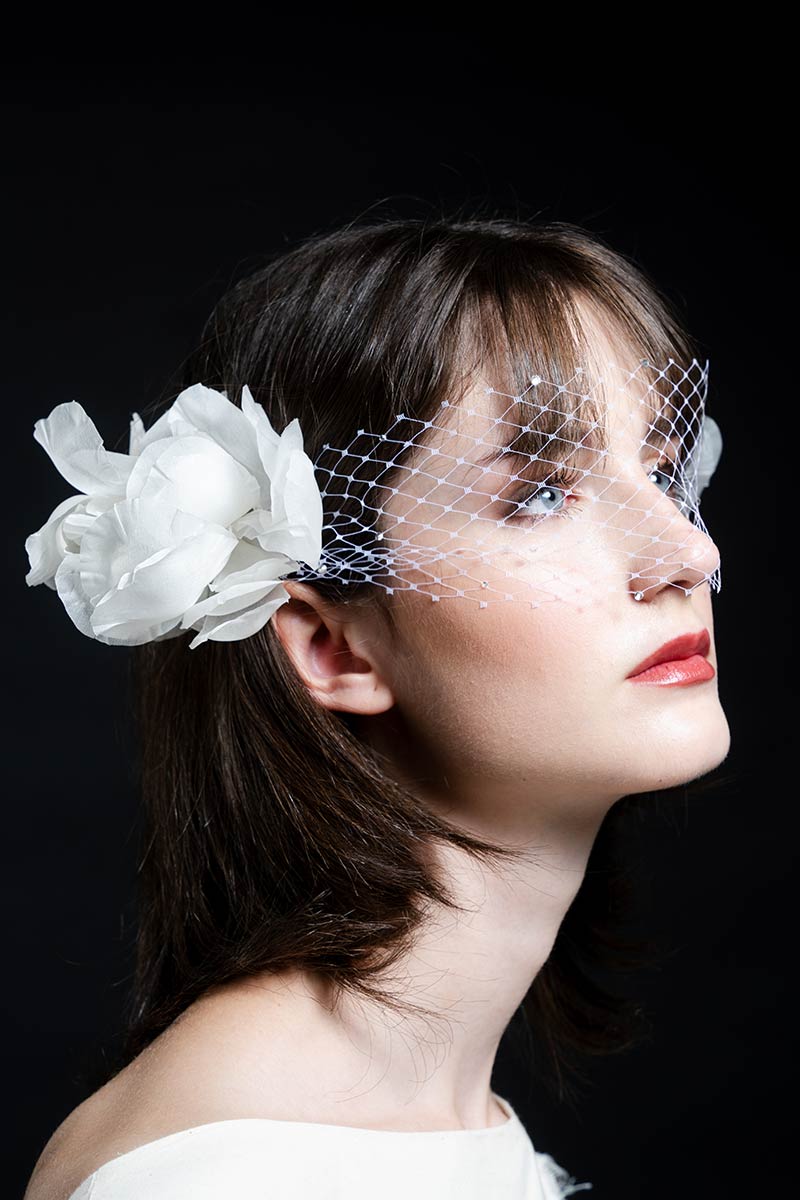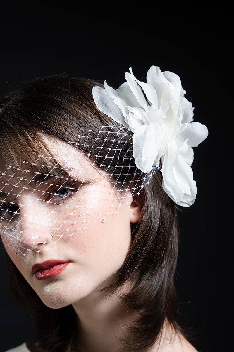 Pieza compuesta por flores de organza en los laterales, velo rejilla delantera con strass en cristal, pieza ideal para pelo recogido o semirecogido. Talla única.
